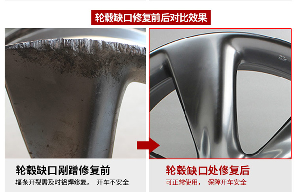 由于驾驶不慎导致轮毂缺口、严重刮伤,千万别忽视小小的缺口、刮痕,这存在严重的安全隐患,千万别让它影响您的安全隐患,我们轮毂修复专家通过专业的焊接设备,密闭测试,抛光,烤漆等程序可以进行完美修复,如果您担心安全问题,轮毂在铸造过程中也是同铝合金溶液进行铸造组合的,同样的,我们焊接也是用同等铝合金材质进行里外焊透,所以不用担心质量问题。